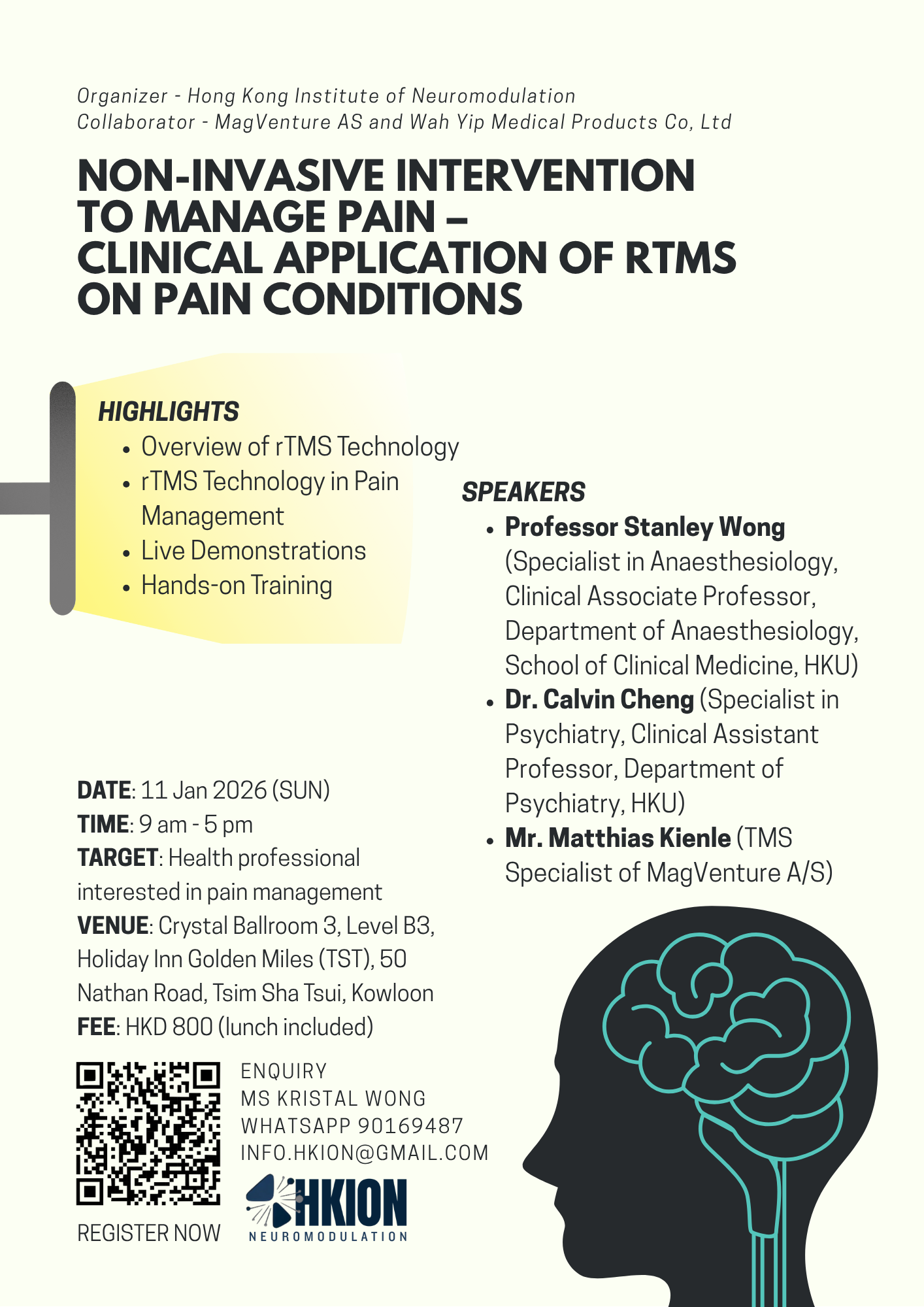 Non-invasive brain modulation was not yet very popular in Asia. It is good to have chance to share the clinical application of repetitive transcranial magnetic stimulation (rTMS) in Bangkok.